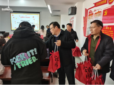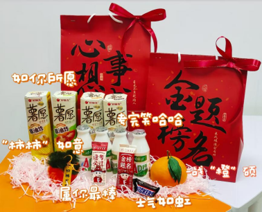 现场为考研学子发放考研大礼包。大礼包包含着被赋予特殊含义的暖心礼品,薯愿寓意着“如你所愿”,AD钙奶寓意着“考完笑哈哈”,柿子挂坠寓意着“柿柿如意”,士力架寓意着“士气如虹”,橙子寓意着“一战橙硕”,棒棒糖寓意着“属你最棒”。