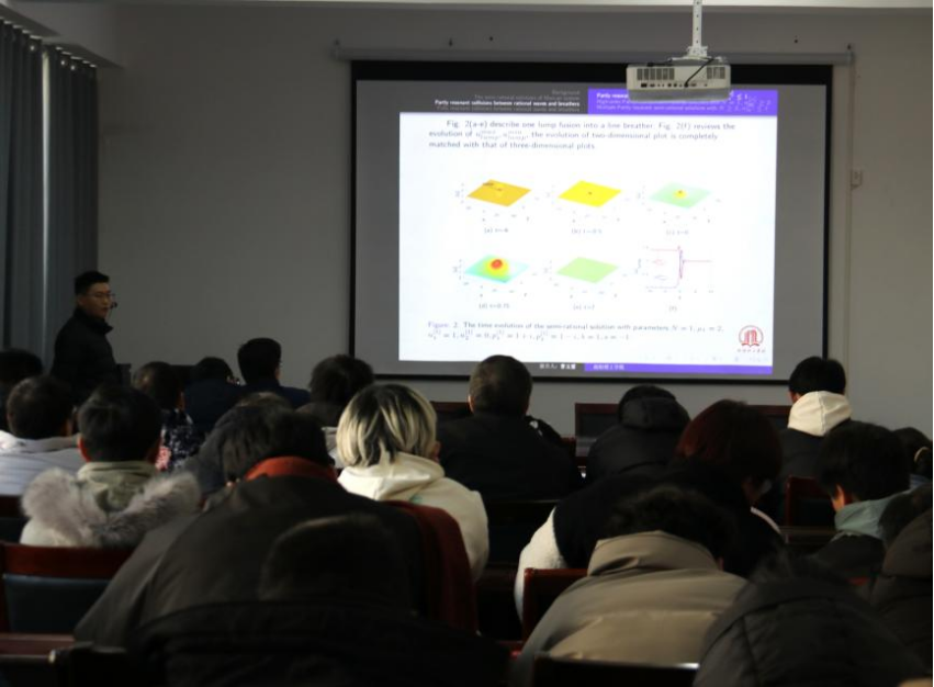 曹玉雷博士汇报了关于非线性Maccari系统中的局部波研究,探讨了非线性系统中的波结构和碰撞现象。通过图像的展示,曹博士向同学们解释了非线性系统中的特殊波及其产生的机理。