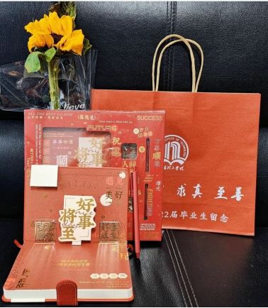 典礼开始前,大屏幕播放毕业生们拍摄的留念视频和老师以及学弟学妹们的祝福视频,视频带领毕业生回顾老员工活的美好时光。毕业班辅导员冯清在会场入口处为每个毕业生送上专属定制毕业礼物以示祝福。
