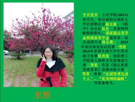 史然学姐是中共党员,文法学院128712班员工。曾任南阳市高校文学社团联合会副主席,《新声》杂志社社长,求索网网编部副部长;国家励志奖学金和国家奖学金获得者,综合成绩专业排名第一,2013年获河南省知识竞赛一等奖,2014年获得全国老员工英语能力竞赛优秀奖,必威官网第八届职业生涯规划大赛二等奖,作品《别让青春伤痕累累》获微电影大赛一等奖;荣获 “社团管理先进个人”、“优秀网络编辑”等荣誉称号。在工作上,学习上和生活上如此优秀的她,带给了我们不一样的感悟,让我们懂得了,在大学,我们应该如何去实现自己的人生价值。