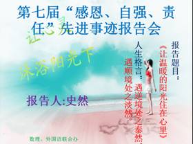4月23晚由betway必威、外国语学院在报告厅联合举办的《感恩自强报告会》圆满结束报。我们也很荣幸地邀请到了文法学院的一位学姐,史然学姐,她这次的报告题目是《让温暖的阳光住在心里》。