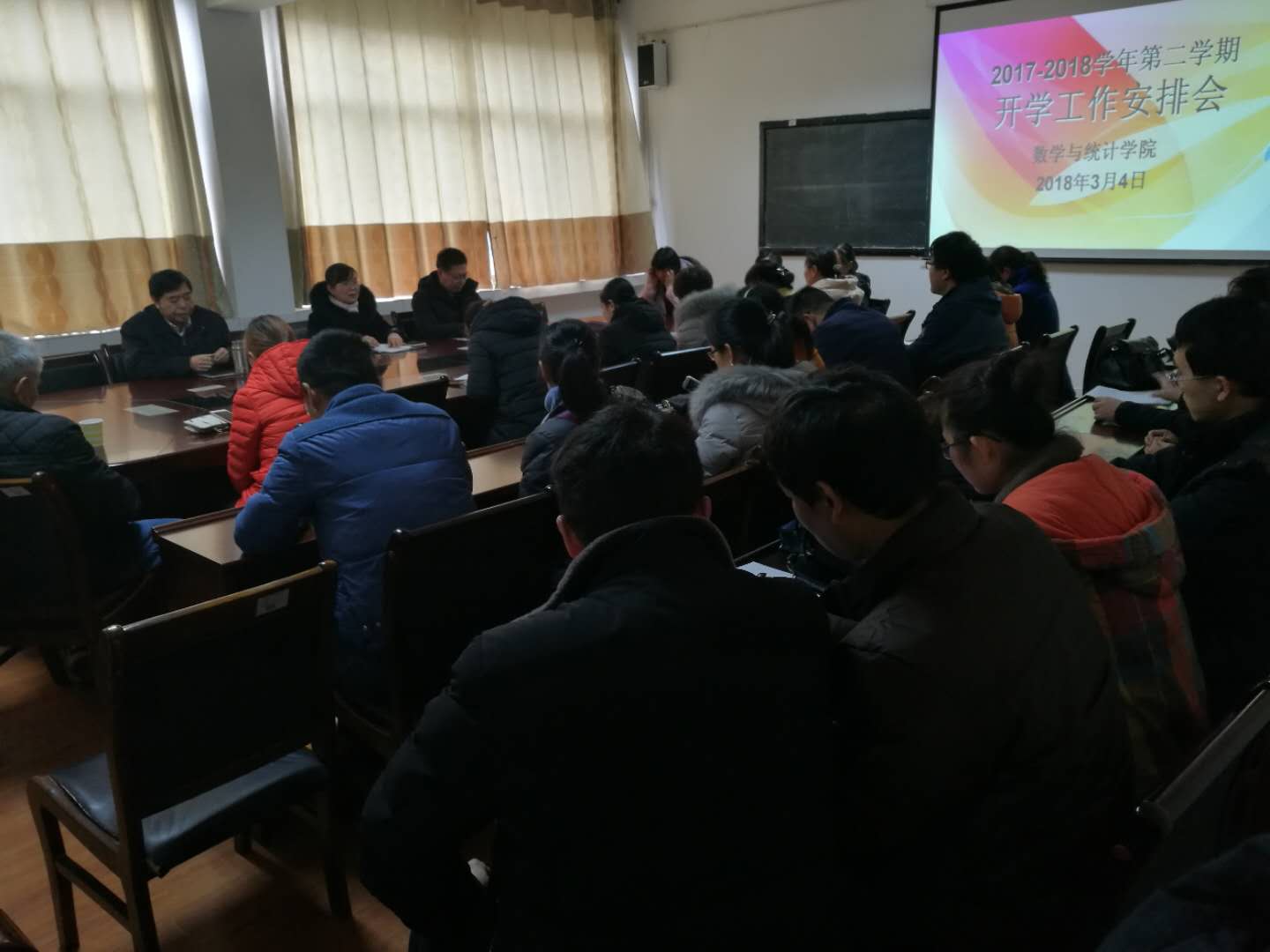3月4日上午十点,数学与统计学院召开全体教师会议,安排部署近期工作及2018年工作重 点,会议由朱玉清经理主持,朱经理从毕业生实习、标准化教研室建设、教学工作等八个方面明确工作重点,提出新的一年要有新的理念、新的思想、新的亮点,在稳步推进各项工作的基础上要有创新,争取打造若干重点和亮点,形成自身特色。