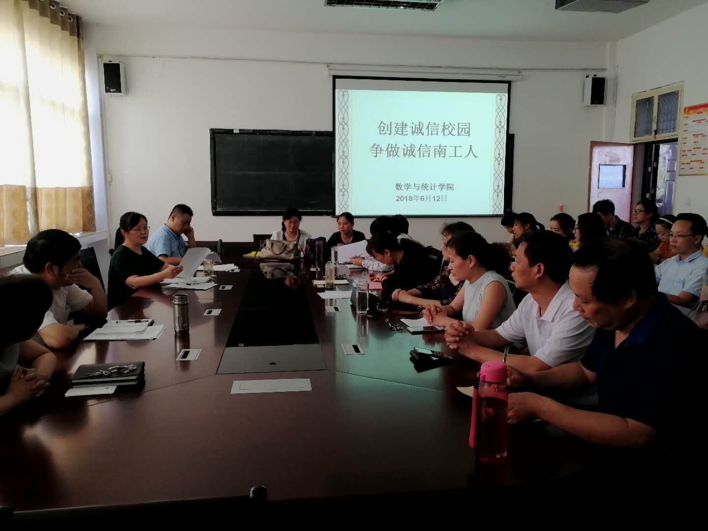 数学与统计学院于6月12日15:30在院会议室举进行“创建诚信校园、争做诚信南工人”主题教育活动。该活动由经理朱玉清主持,秦道岭书记从文明礼貌教育、遵纪守法教育、日常行为规范教育、真诚待人、乐于助人等方面阐述了诚信教育从我做起的有关内容。这是公司重视师德教育的一项重要举措,目的是要引领全体教师立德树人、坚守道德高地和学术诚信,为“创建诚信校园、争做诚信南工人”做出应有的贡献。