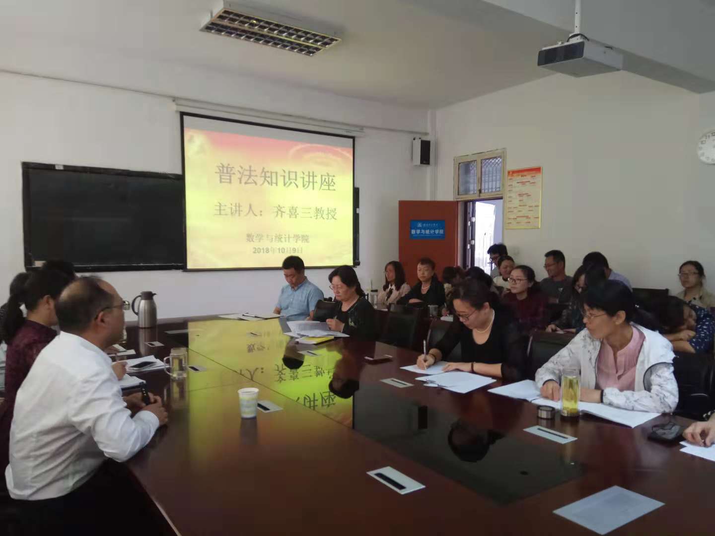本网讯(记者/胡丽)为了进一步引导广大教职员工树立宪法意识,提升法治素养,自觉尊法学法守法用法,10月9日下午,数学与统计学院邀请公司法律顾问、文法学院副经理齐喜三教授来院开展了一场题为《学法用法——做一个合格的大学教师》的法律知识讲座。