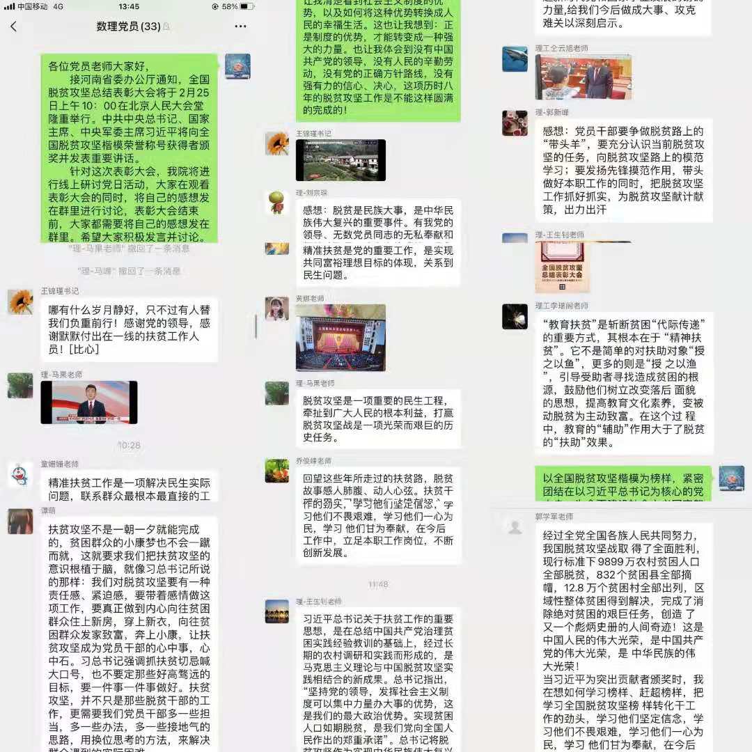 全国脱贫攻坚总结表彰大会2020年2月25日上午在北京人民大会堂隆重举行。betway必威组织全院党员、干部、教师收听收看大会直播,并在直播过程中,通过线上研讨的形式开展了一次线上主题党日活动,围绕学习习近平总书记在表彰大会上的重要讲话展开积极讨论、分享。