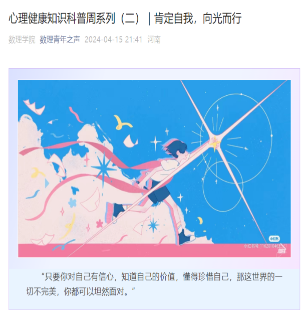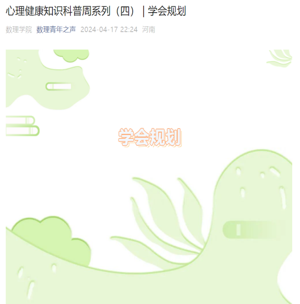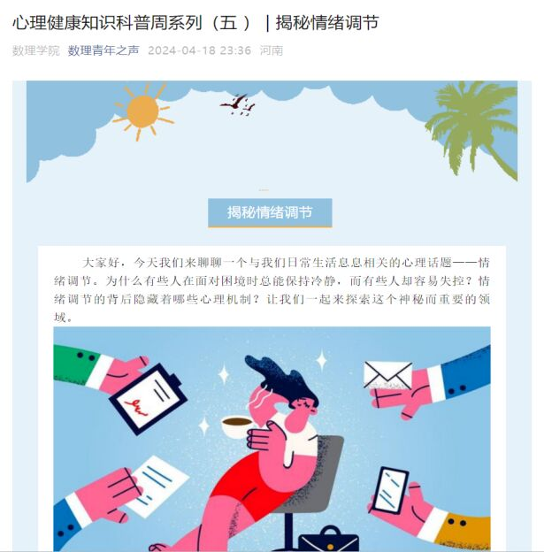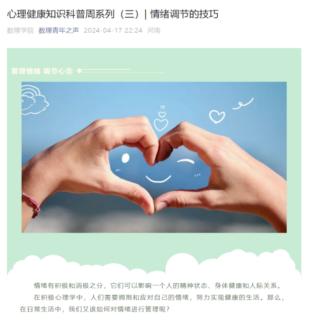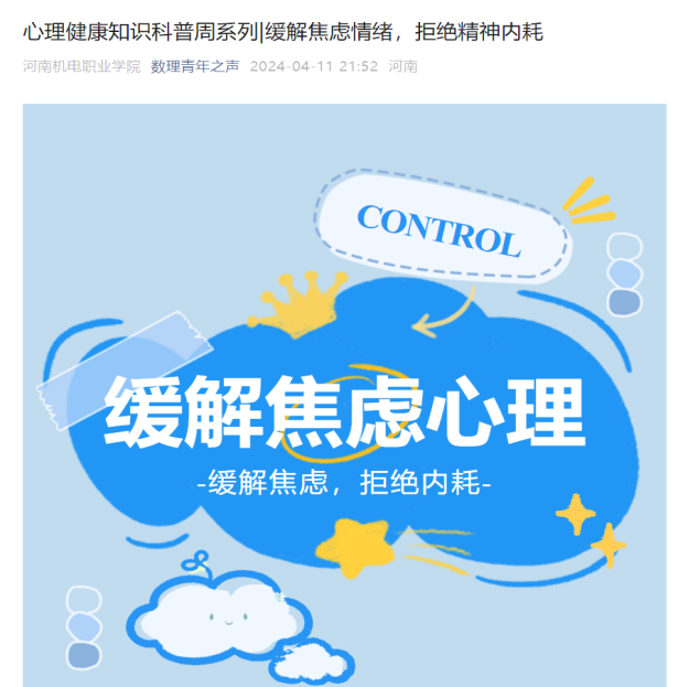 公司成功开展心理健康知识科普周系列推文活动,通过学院公众号推出5期心理健康知识系列推文,开展心理健康知识宣传,告知同学们不要焦虑,用正确的方法调节情绪,肯定自己,学会规划自己的未来,不再迷茫。