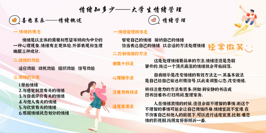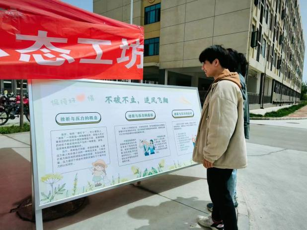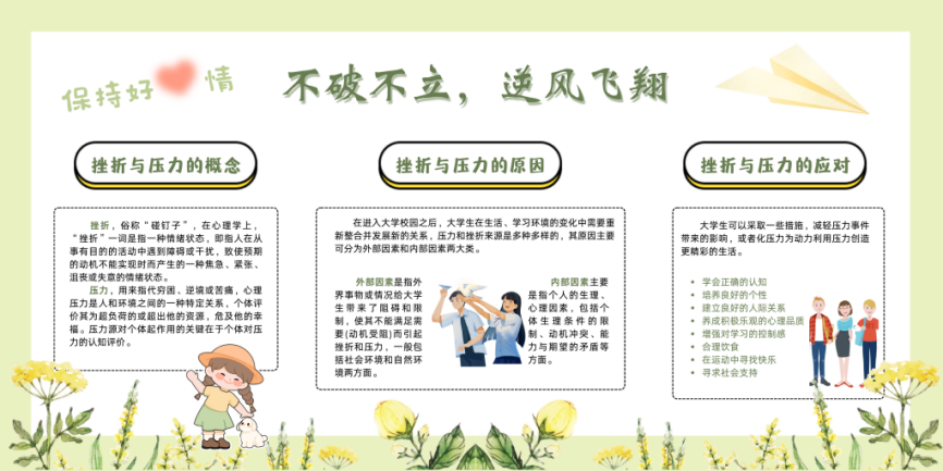 公司为更好地科普心理健康知识,制作了两块展板方便大家阅读。展板主要内容包括对情绪的认知、对挫折压力的了解。通过展板可以让同学们更好了解情绪、控制情绪,以此来调整自己的心态;了解挫折和压力,在未来的学习和工作中用正确的方式应对挫折,缓解焦虑和紧张。