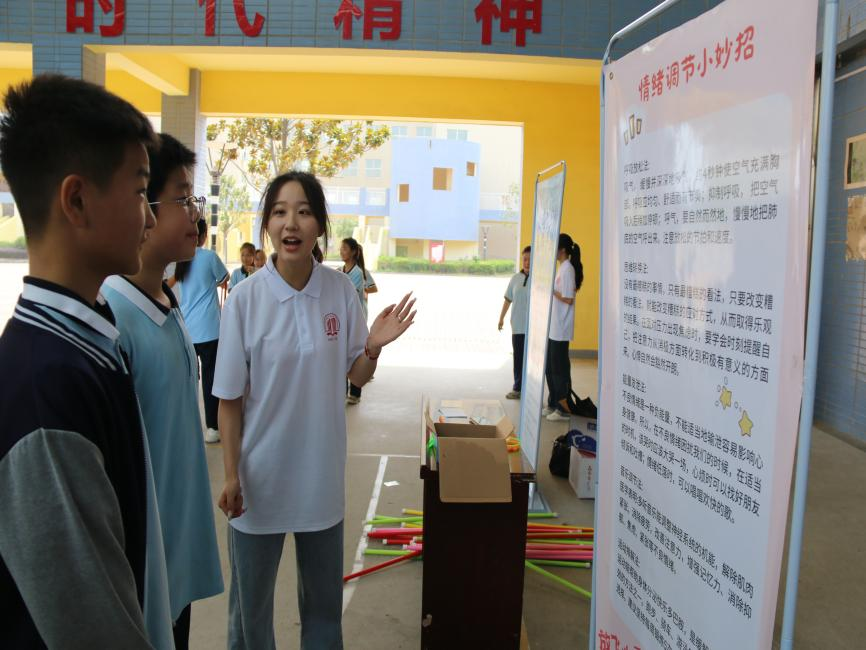 在心理素质拓展活动四周,布置了各种心理知识展板,实践团队成员通过讲解宣传栏、发放宣传手册等方式,耐心地向员工们讲解心理健康知识,包括“小员工常见的心理问题与调节方式”、“抑郁症的识别”、“情绪调节小妙招”、“如何处理人际关系”等专题内容。引导青少年员工学习掌握一定的心理健康知识,增强自我调适能力,锻炼养成健康心理素质,并消除对心理健康问题的“病耻感”。员工们纷纷表示,通过阅读宣传栏和宣传手册,他们对心理健康有了更深刻的认识,也学会了如何更好地管理自己的情绪和应对压力。