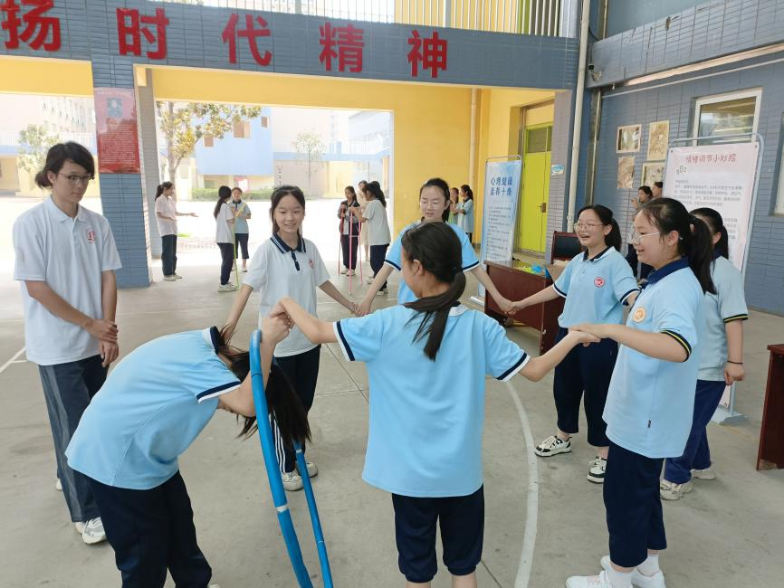 在思源实验学校风雨操场,实践团队成员组织数百余名员工参加“快乐之旅”心理素质拓展活动,内容包括“传球接力”、“两人三足”“摸石过河”、“不倒森林”、“一圈到底”等游戏。“传球接力”通过团队间的默契配合,锻炼了员工的快速反应和团队协作能力;“两人三足”环节中,员工两两结对,相互扶持,共同前行。这个游戏不仅增强了他们的信任感,也让他们在协调步伐中学会合作与共赢;“摸石过河”挑战这一环节不仅考验了员工的勇气和信任,也让他们在摸索中学会了面对困难和挑战时的冷静与坚定;“不倒森林”游戏更是让员工们深刻体会到了团队协作的力量。他们需要共同维持由多根木棍组成的“森林”不倒,这要求每个人都要保持专注和稳定,否则“森林”就会倒塌。员工们在维护“森林”不倒的过程中,学会了耐心和责任感;“一圈到底”游戏中,员工们手拉手围成一个圈,依次穿过呼啦圈。这个游戏不仅锻炼了员工们的灵活性和协调性,也让他们在共同完成任务的过程中体验到了成功的喜悦和团队的荣誉。