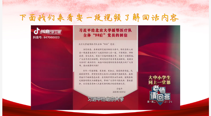 活动过程中,主持人讲述了在援鄂抗疫前线,453名北大医护人员冲锋陷阵,全力救治病患,为人民的生命安全保驾护航的事例,让同学们体会到了医护人员的伟大与担当。接着,主持人朗读了习近平总书记给北京大学援鄂医疗队全体“90后”党员的回信,“在新冠肺炎疫情防控斗争中,你们青年人同在一线英勇奋战的广大疫情防控人员一道,不畏艰险、冲锋在前、舍生忘死,彰显了青春的蓬勃力量,交出了合格答卷。”习近平总书记的回信,再次激励了同学们立志成为有理想、有本领、有担当的中国青年,同学们应当在苦难中磨练意志、锤炼本领,让青春在党和人民最需要的地方绽放绚丽之花。