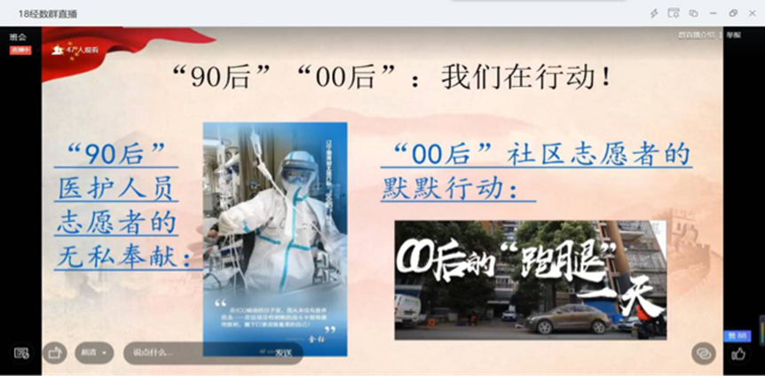 19经数班团支书播放了一段视频,视频中同学们看到了各省自愿支援到前线的战士们的身影,他们报身国家,不惧任何艰难险阻。员工积极在线上进行了讨论,纷纷表达了自己对援鄂医疗队的敬佩之情。一位同学分享道:“‘90后’青年一代,曾经在网络遭受过许多质疑与批判,但在疫情面前,他们用实实在在的行动证明了自己。我们‘00后’也应如同他们一般,不负祖国希望,尽自己的一份力,为党为人民,奋斗拼搏。不惧,本是青春模样;不退,彰显青年担当。”