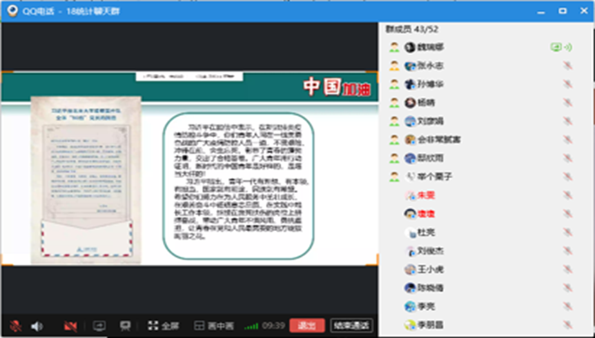 18统计班同学讨论了对本次疫情防控的思考,如何“让青春在党和人民最需要的地方绽放绚丽之花”。有同学表示:“最重要的不是‘几零后’,而是‘努力后’‘奋斗后’,能够到祖国最需要的地方去,能够为国家做贡献、为人民服务,才是实现人生价值的最好途径。”