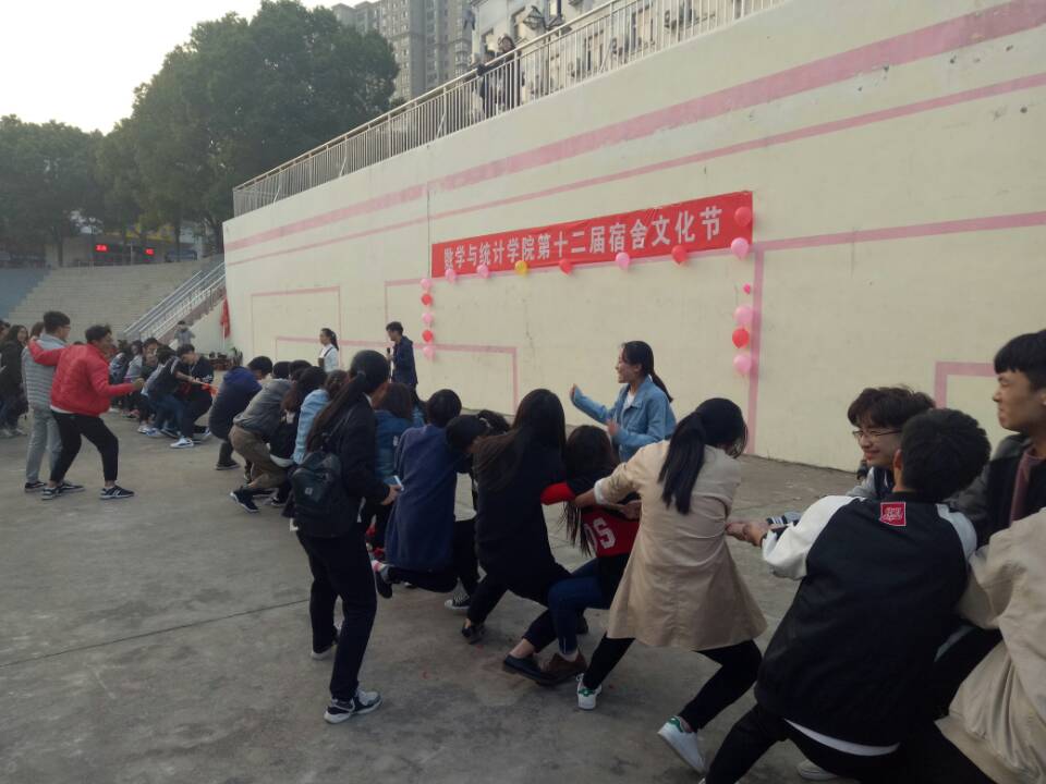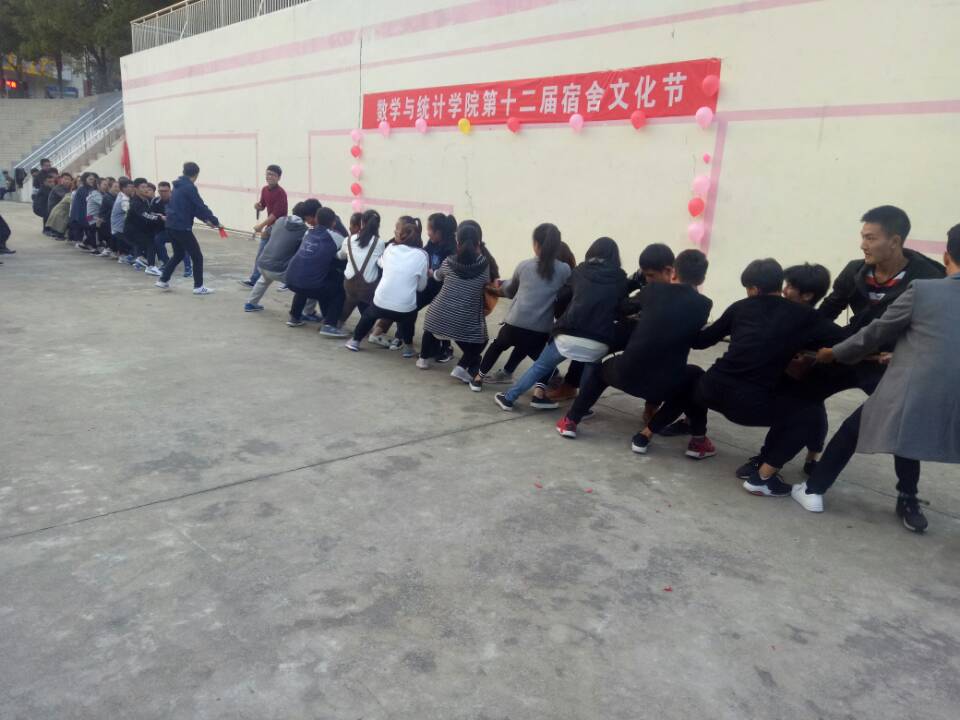 宿舍文化节以拔河比赛的形式拉开帷幕,此次比赛分为四组,每组20人,比赛实行淘汰制晋级方式。当比赛哨声响起,队员们一起高呼着“一二,一二”的口号,双手紧握着长绳,憋足了劲拼命往后拉,为比赛献出一份力量。其余同学自发组成啦啦队为本班同学加油,陈书记也在队伍旁边替同学们加油鼓劲。经过激烈的耐力、体力较量,最终16级经数班获得此次比赛的冠军。最后,由17级辅导员冯清点评本次比赛。