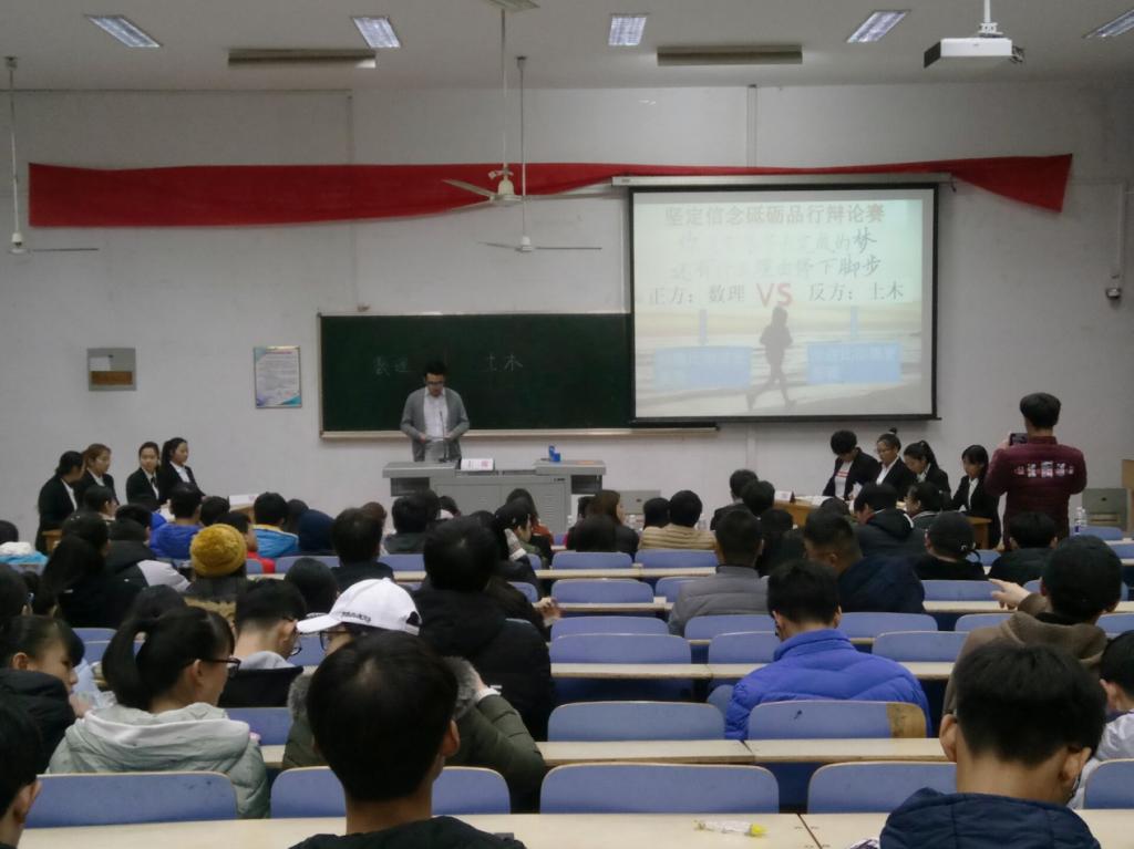 本网讯(员工记者/符豆豆、李婷)为丰富老员工的课余生活,培养同学们的思辨能力和语言表达能力。12月9日,以“坚定信念,砥砺前行”为主题的辩论赛在6教101教室举行。此次比赛在公司辩论队与土木工程学院辩论队之间展开,来自不同学院的大三优秀辩手共计10人担任本次比赛评委。我公司党总支委副书记陈同勉,辅导员冯清及近两百名同学观看了这场比赛。