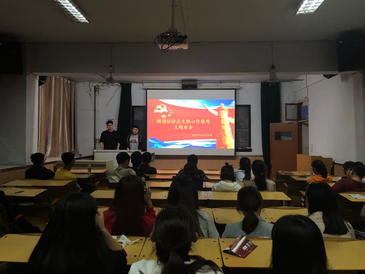 本网讯(员工记者/符豆豆)4月1日晚,数学与统计学院2017级近70名员工在1号教学楼1515教室举办“解读社会主义核心价值观”主题班会。