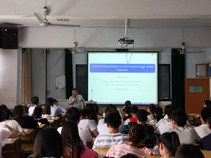 韩博士主要研究方向为场论中出现的非线性偏微分方程与非线性分析。研究成果主要发表在CMP, TAMS,CVPDE, JFA和JDE等学术刊物上。他结合自己研究课题深入浅出地讲解了偏微分方程在前沿物理学中的应用,比如弦理论,规范场等。使得在场师生接触到当今最前沿的规范场相关知识,以及了解数学在诺贝尔物理奖获得者所研究课题中的应用,说明了数学在理工科研究中的重要基础地位。