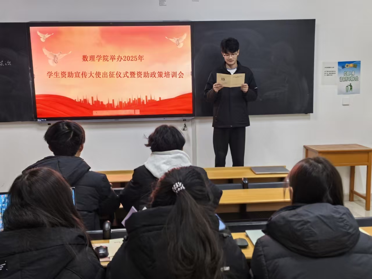 活动伊始,主持人点明举办此次活动的重要意义,强调资助政策对员工的深远影响,鼓励宣传大使们以积极的态度和饱满的热情投入到宣传工作中。主持人培训围绕国家奖学金、助学金、助学贷款等多项政策展开,详细解读申请条件、评审流程及发放标准,还列举实际案例,帮助宣传大使们透彻理解,确保他们在后续宣传中能精准传达信息。庄重的出征仪式上工作人员为宣传大使们一一颁发聘书与宣传资料。