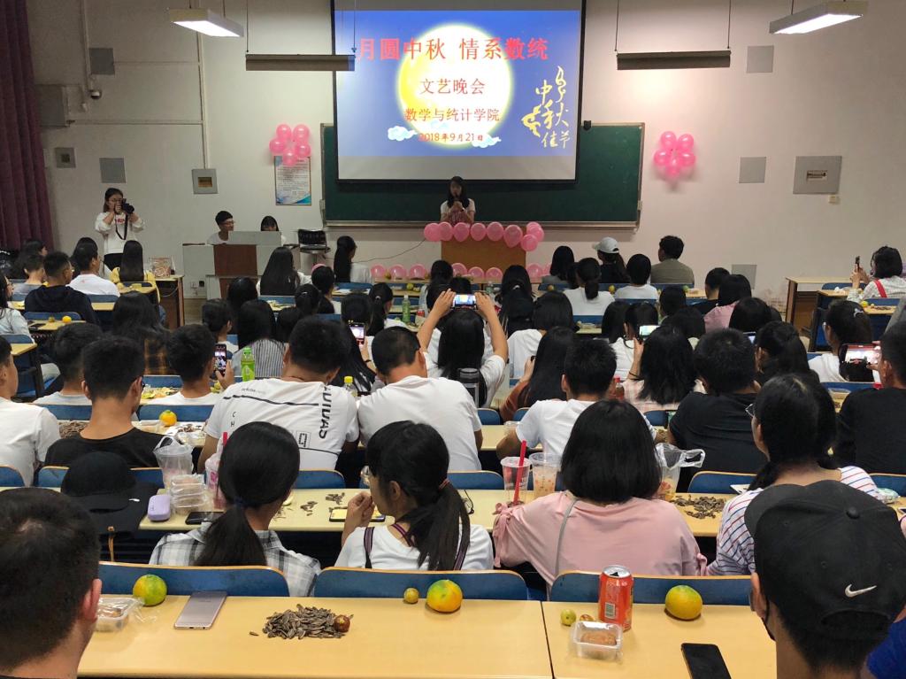 本网讯(特约记者/冯清 员工记者/罗琳燕)9月21日晚,数学与统计学院在十四教二阶六教室举办了以“月圆中秋,情系数统”为主题的文艺晚会。晚会由2018级新生孙博华、胡晓莉主持,数学与统计学院近百名师生参加。