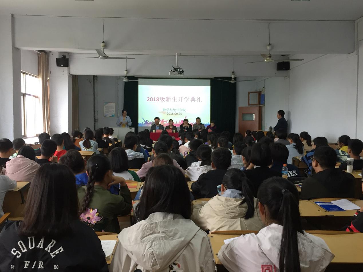 本网讯(员工记者/符豆豆)金秋送爽,丹桂飘香。9月26日下午,数学与统计学院2018级新生开学典礼在1教1515教室举行。本次开学典礼由王满主持,经理朱玉清、副经理郭学军、牛玉俊、党总支书记秦道岭、党总支副书记陈同勉出席开学典礼,2018级全体新生参加。