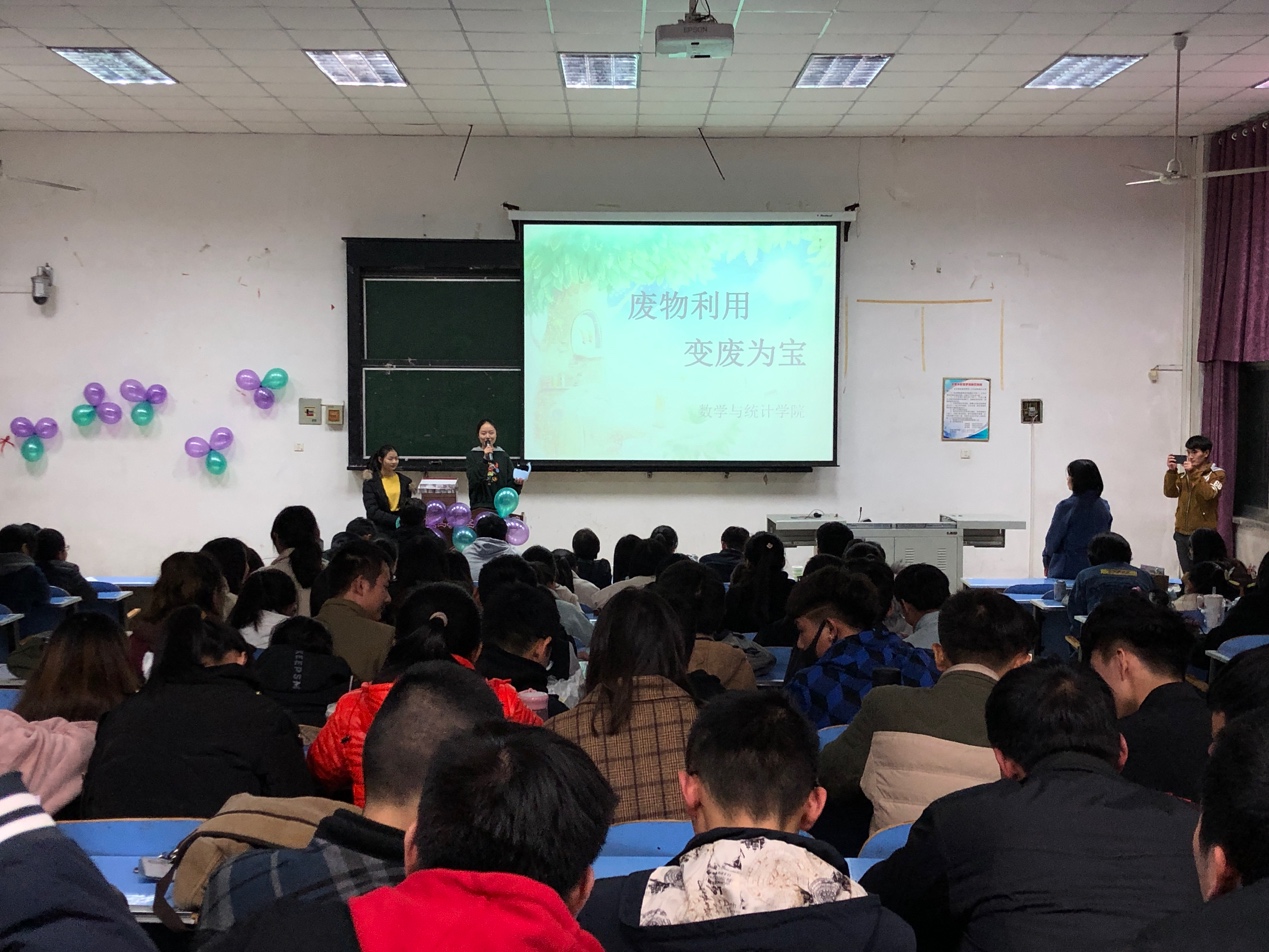 本网讯(员工记者/李婷 符豆豆)为丰富宿舍文化生活,营造整洁、环保校园环境。11月20日,数学与统计学院在五阶一教室举行“变废为宝”设计大赛。党总支副书记陈同勉及17、18级全体同学参加。