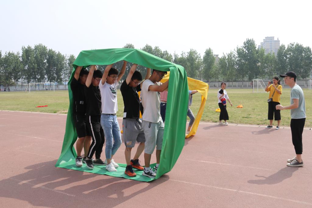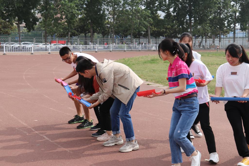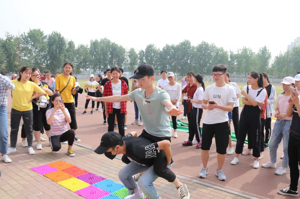 紧接着是第二轮比赛,需要五个同学用脚向前传递布条,走到终点的一瞬间,早已等候在终点处的三位同学,便开始摇晃起了装在腰间盒子里的小球,当三位同学的小球都被摇晃出来后,再由另外五个同学将布条传递回起点,用时最短的一方将获得胜利。比赛过程非常激烈,双方都不甘示弱,但都带着游戏的欢乐去完成这场比赛。