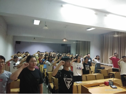 首先,主持人带领大家一起观看了相关视频,走进我们与祖国共奋进的世界,了解祖国70年砥砺前行,70年波澜壮阔的伟大历史进程。视频中指出心中有梦,只要出发,就会到达;既要仰望星空,又要脚踏实地。随后进入互动环节,同学们踊跃上台发表感想。最后由团员代表带领全体同学宣读誓词,铿锵有力的入团誓词引领我们时刻牢记自己的身份,持之以恒增强共青团仪式。