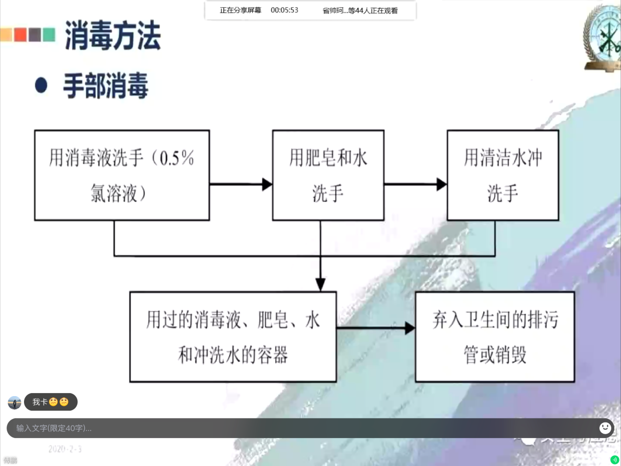 班会过程中,主持人对新型冠状病毒相关知识、新冠肺炎感染症状、预防感染措施以及新冠病毒与SARS病毒的区别等内容进行了详细的讲解,提醒同学们,虽然疫情有所好转,但仍不能掉以轻心,继续遵守居家防控的规定,不外出、不聚集,勤洗手、戴口罩,保护好自己。同时,要求同学们在家上课期间要充分利用在线课程平台,坚持读书学习和思考研究,做到停课不松懈、学业不停歇。最后,主持人和大家一起学习了《阳光心态,抗击疫情——河南省高校师生心理应对手册》,了解到面对疫情我们需要提高自我认知、认识应激、接纳焦虑、寻找资源、用积极信念调整心态。并学会用腹式呼吸放松法、安全平静技术、蝴蝶拍术等方法来调整自我情绪,提升自我管理,安心抗疫。