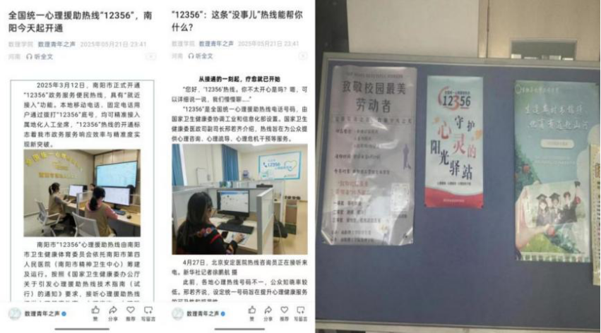 5月20日—5月25日,公司开展“12356”全国统一心理援助热线推广活动。通过张贴海报、发送推文、转发员工微信群等方式,告知员工心理问题求助途径,增强员工心理求助意识,丰富校园心理健康支持网络。