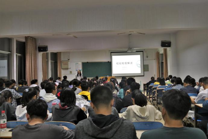 斯楚涵首先向同学们解读了公司校训“厚德,博学,求真,至善”的含义,其分别为求学治学的前提和基础、过程和目标、态度和方法,以及做人治学的境界和理想。她强调,作为南工学子还要谨记“不甘示弱”的南工精神,努力奋斗,锐意进取。斯楚涵又向同学们讲解了学校的相关规定,如员工管理规定、学业警示管理办法、奖助学金评审及发放办法、违纪处分、宿舍管理办法等内容。并结合身边发生的例子,向同学们强调了校规校纪对于个人发展的重要意义,要求同学们要时刻遵守纪律,提高个人道德水平,营造良好的校园生活氛围。最后,斯楚涵解答了同学们关于校规校纪的一系列问题。
