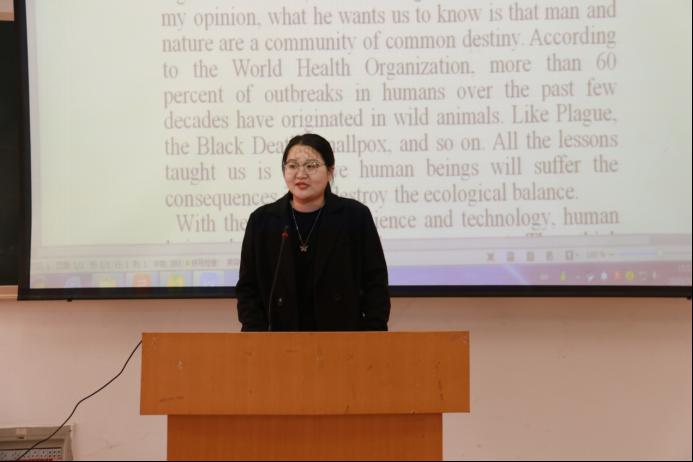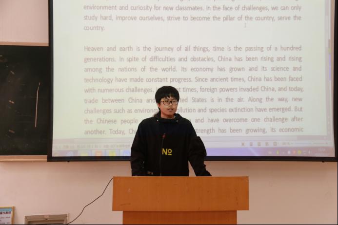 首先,主持人对本次比赛规则进行说明,提醒选手应该注意的事项。比赛过程中,虽然现场氛围紧张,选手们的脸上依然洋溢着自信的微笑,以流利的口语充分展现了自己的风采。在演讲过程中,选手们以沉着冷静的姿态,清晰地表达了自己独特的思维与视角,充分展现了当代青年充满活力与朝气的精神风貌。19统计班邵谦同学从猎人与熊出发,引出人与自然应该和谐相处的主题。她凭借清晰流利的口语,声情并茂的演讲获得了评委老师们的一致赞赏。经过激烈的角逐,参赛选手邵谦荣获一等奖,刘万嘉和王云峰荣获二等奖。最后,由乔老师为参赛选手进行点评,并为获奖选手颁奖。