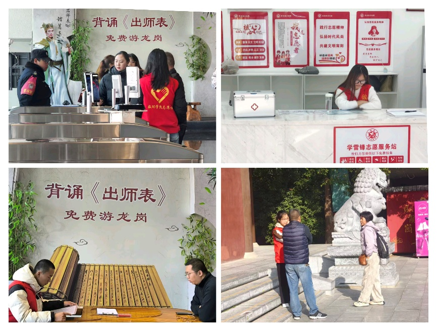 活动现场,志愿者们分工明确、热情投入。部分同学手持扫帚、抹布,细致清扫古柏道、碑廊周边的落叶杂物,认真擦拭《出师表》石刻展板与文物标识牌;另一部分同学则在卧龙岗景区入口及游览步道协助引导游客,宣传文明游览注意事项。他们忙碌的身影,展现出志愿服务的精神风貌,也为景区增添了温馨与活力。