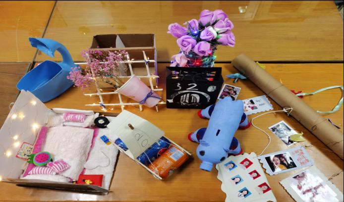 本次比赛要求同学们提前利用空瓶子、零食盒、洗衣液瓶、废布料等生活中轻易可见的废品,制作出可利用的生活品,解决废品处理困难的问题,避免造成不必要的浪费。比赛开始,各宿舍宿舍长通过抽签的方式决定出场顺序。同学们的作品取材不同,形式多样,有一次性筷子和毛线搭建成的花园;用纸箱拼接的储物盒;洗衣液桶做的花盆等。其中10号楼407宿舍的作品《破破》是由橡皮筋、蛋挞盒、积木和卡通画等制作的缩小版宿舍布景图。宿舍成员陈思桦表示,虽然我们整个宿舍都来自不同的地方,远离自己的家人,但我们在这里又找到了新的家人。这个作品就是我们宿舍之家的缩影。最终,10号楼323宿舍的作品荣获了一等奖,10号楼407和320获得二等奖,10号楼220、317和6号楼202获得了三等奖。