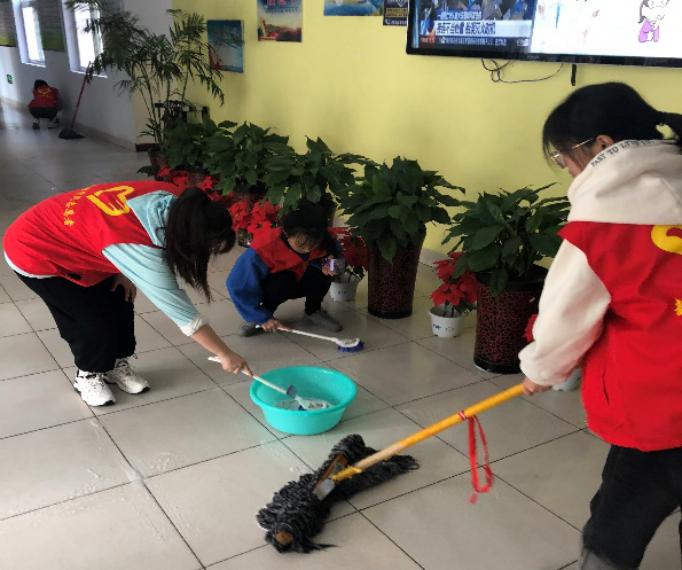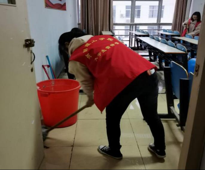 志愿者们正在清扫宿舍楼
