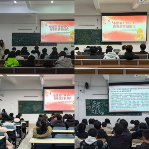 各班团支书紧扣主题,结合时代背景与青年使命,深入阐述“初心”的内涵与新时代青年的责任担当。班会通过播放红色主题短片、分享先进青年事迹等形式,带领同学们回顾百年来青年一代的理想与坚守,感受当代榜样青年的实干与风采,引导大家在沉浸式学习中夯实思想根基、凝聚奋进力量。