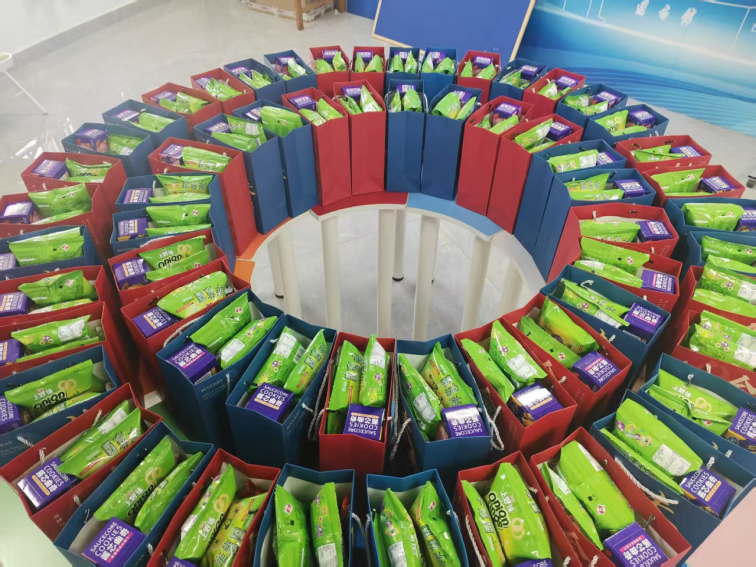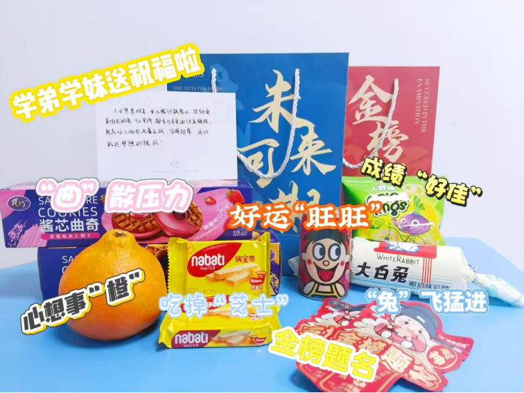 老师们为同学们送上精心准备的“加油包”。其中,曲奇饼干寓意“曲”散压力;旺仔牛奶代表好运“旺旺”;橙子象征心想事“橙”;芝士饼干意为吃掉“芝士”;大白兔糖果表示“兔”飞猛进;上好佳寓意成绩“好佳”;印有“金榜题名”的棒棒糖则寄托美好期许。此外,还有学弟学妹们亲手书写的祝福贺卡。同学们激动地接过礼物,纷纷表示将全力冲刺,不负学院期望与自身努力。