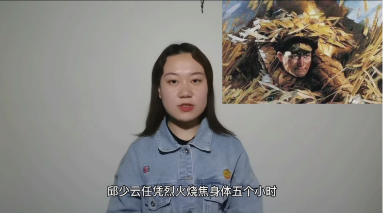 张茹萍同学讲述了“一级英雄”邱少云的悲壮故事。中国人民志愿军战士邱少云被选派参加潜伏部队,并担任了发起冲锋后扫除障碍的爆破任务。敌机向他所在的潜伏区进行低空扫射,并投掷燃烧弹。火势蔓延到他身上,为了不暴露潜伏目标,邱少云任凭烈火烧焦身体也一动不动。他双手深深地插进泥土里,身体紧紧地贴着地面,直至生命最后一刻,壮烈牺牲。