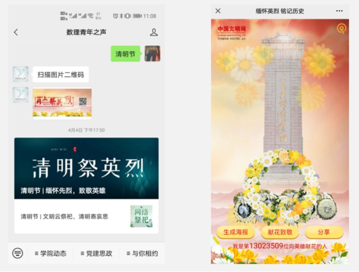 4月3日,全体师生积极响应,纷纷在“数理青年公众之声”公众号等平台,实行虚拟献花、点烛、烧香、献祭品等方式对伟大英烈们进行祭祀,向他们致以崇高的敬意,同时也发表留言、祭文以表达对英雄们的思念。