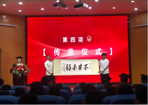 接下来进行了隆重的传承仪式。毕业生代表尹思佳为学弟学妹们赠言。她首先从格物致知以及不甘示弱两方面为在校员工分享个人谏言。接着她代表全体17级毕业生向学弟学妹们赠与了“不甘示弱”四字卷轴,希望同学们能无惧风雨,披荆斩棘,传承“不甘示弱”的南工精神,走过美好的大学四年,走向更有意义的人生。