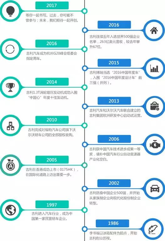 浙江吉利控股集团始建于1986年,从生产电冰箱零件起步,发展到生产电冰箱、电冰柜、建筑装潢材料和摩托车,1997年进入汽车行业,一直专注实业,专注技术创新和人才培养,不断打基础练内功,坚定不移地推动企业健康可持续发展。现资产总值超过2000亿元,员工总数超过7万多人,连续六年进入世界500强。